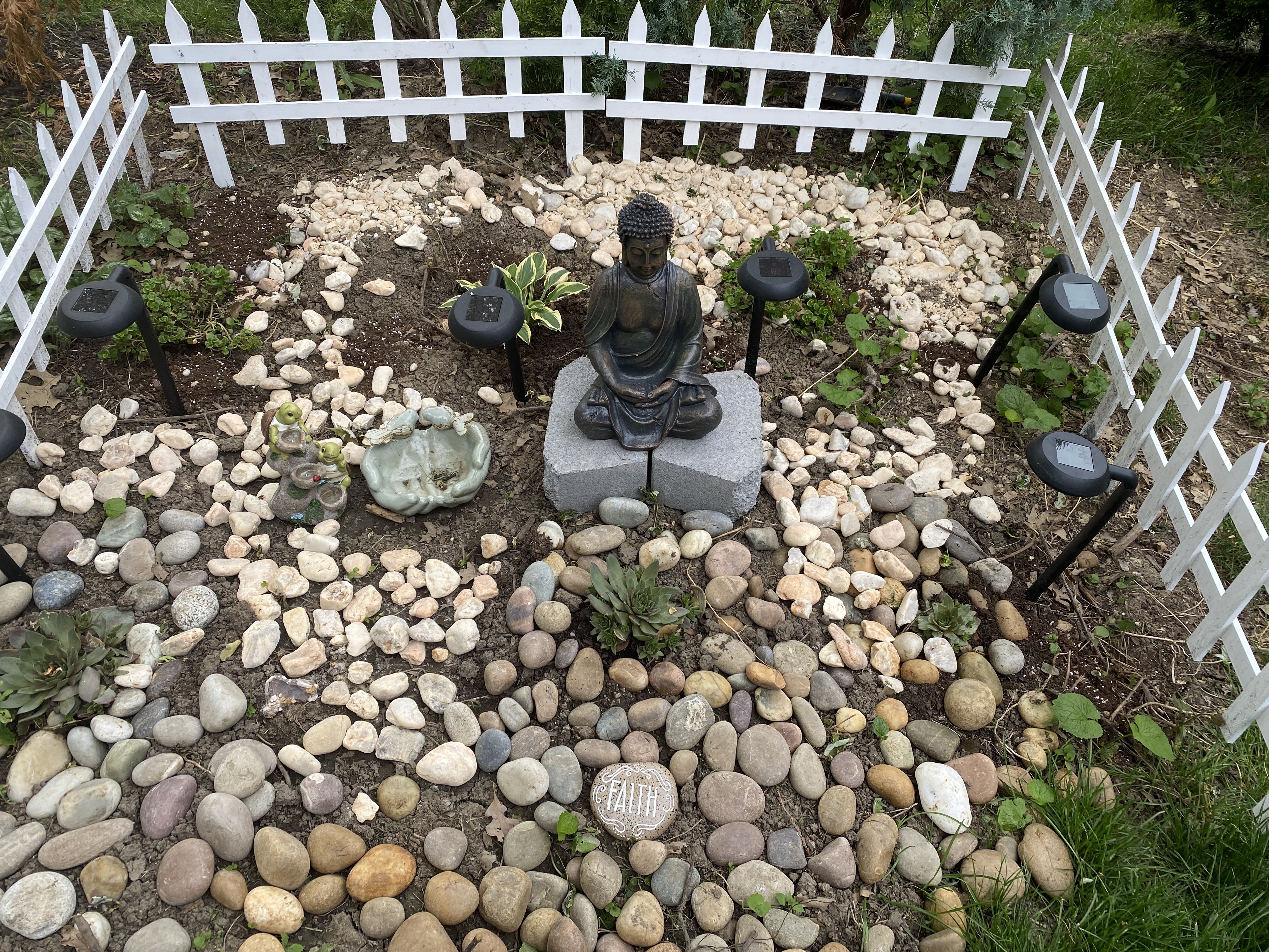 The beginning of pandemic saw me getting attracted to Zen Garden. I really enjoyed looking at them on YouTube and decided to make one. My son painted some pebbles which we had collected from the shores of Lake Erie and made a small one for our sun room. Then last summer we made a bigger one in our garden. Little did I know, the Hen and Chicks which I planted would feed the rabbits, chipmunks and the squirrels. The winter weather conditions did make my white picket fence come down. But spring is on the way and the cleaning for my garden has started. So hoping to improve my Zen Garden.