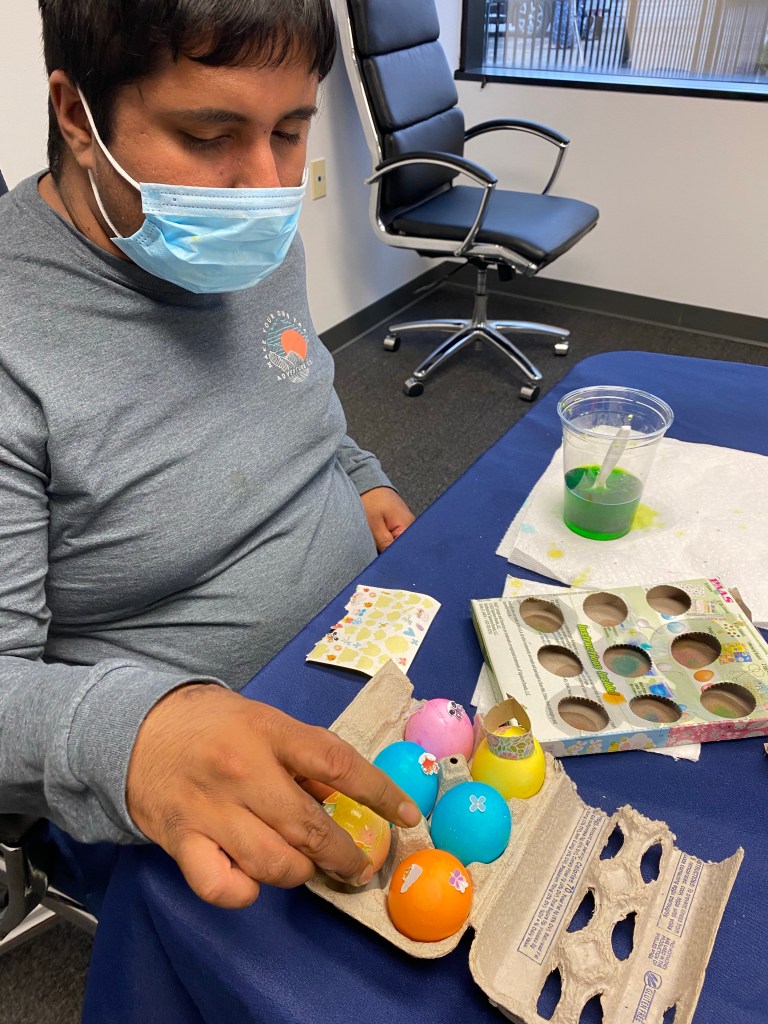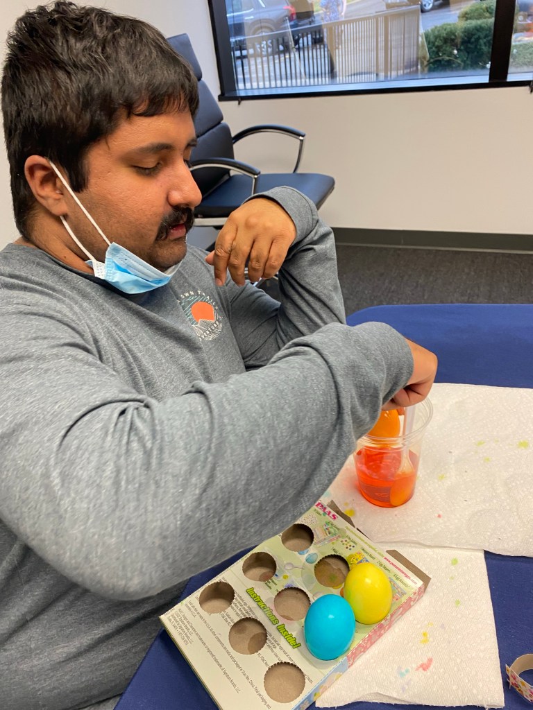 I am not so comfortable around eggs, but last week my son’s program had hard boiled eggs to be dyed for Easter party! It was so much fun. He is now into painting so he loved dipping them in the dye and used stickers after they dried. Here are some pictures and Happy Easter All!