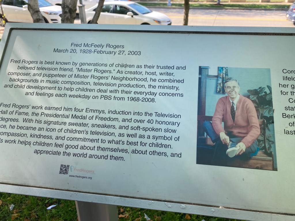 My bucket list showed, visit a National Monument. So when I searched, I found we had Mr. Roger’s statue right here in Pittsburgh. It may not be a National Monument but it is for someone respected by all. Fred McFeely Rogers (March 20, 1928 – February 27, 2003), also known as Mister Rogers, was an American television host, author, producer, and Presbyterian minister.[1] He was the creator, showrunner, and host of the preschool television series Mister Rogers’ Neighborhood, which ran from 1968 to 2001.