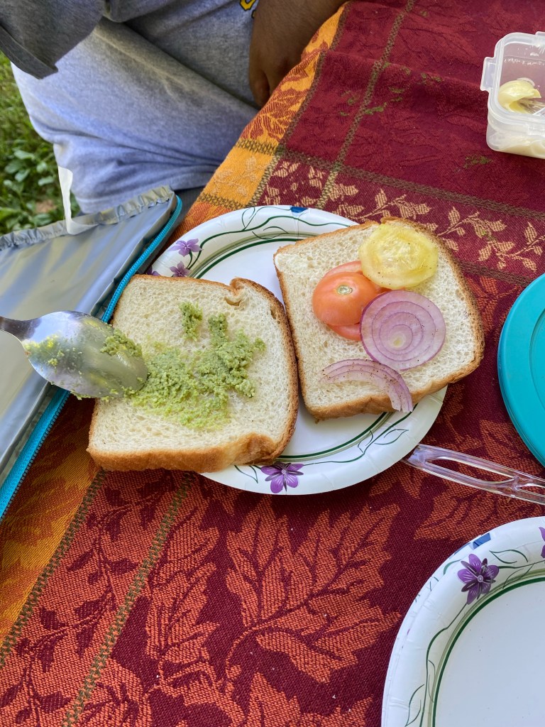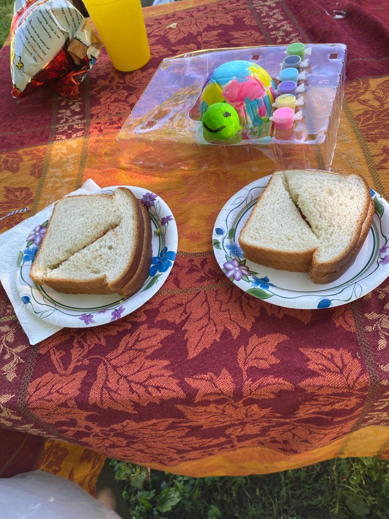 Today we drove to a lake and spent the afternoon/ evening there. It was just supposed to be a paint in the park day but we ended up doing a lot of stuff. It was a nice warm day and we decided to make some cold cucumber sandwiches with mint chutney in the park. My son loves cooking but is not so fond if these cold British tea sandwiches but I thought this would be a great activity to add on today. He did a great job of arranging the sandwiches and got a thumbs up from his brother and his Dad said he was willing to pay three dollars for it.