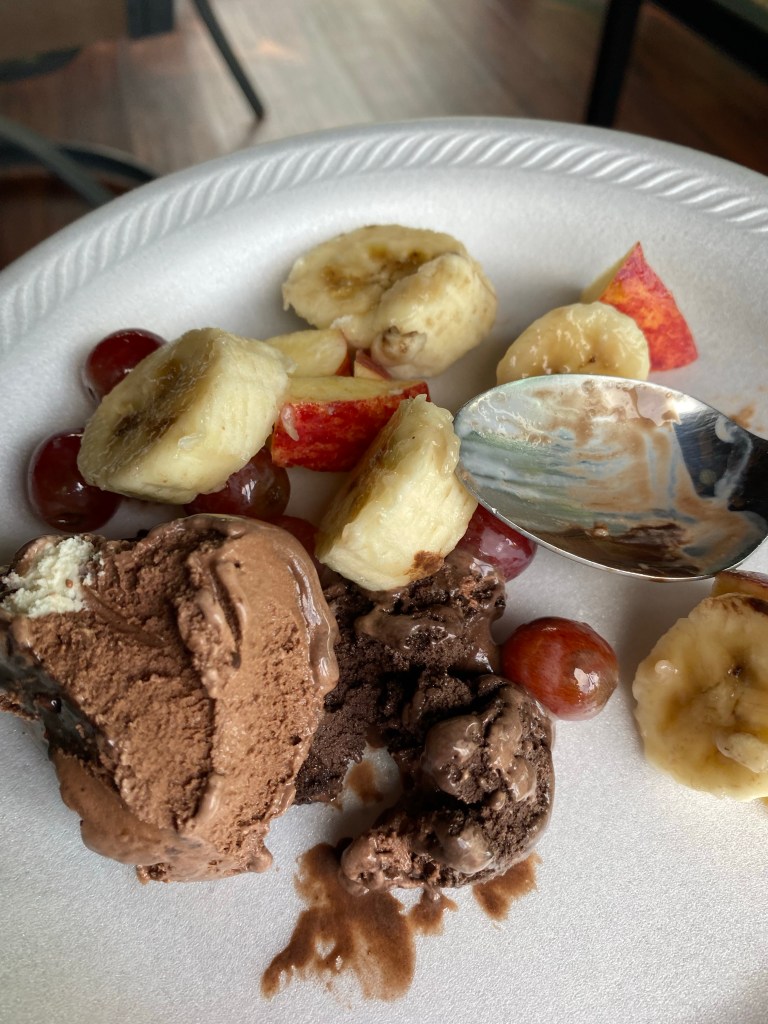 I have become diet conscious , so we topped icecream with fruit salad and had a pitcher of water with lemons and mint.
