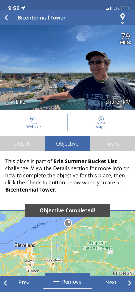 Today I did something similar with my family. I downloaded the Hello Erie App and took a challenge of finishing 5 activities from their bucket list of places to visit. Checking in at 5 places would make me eligible for a 250 dollar gift card at a mall. Check more about it here.