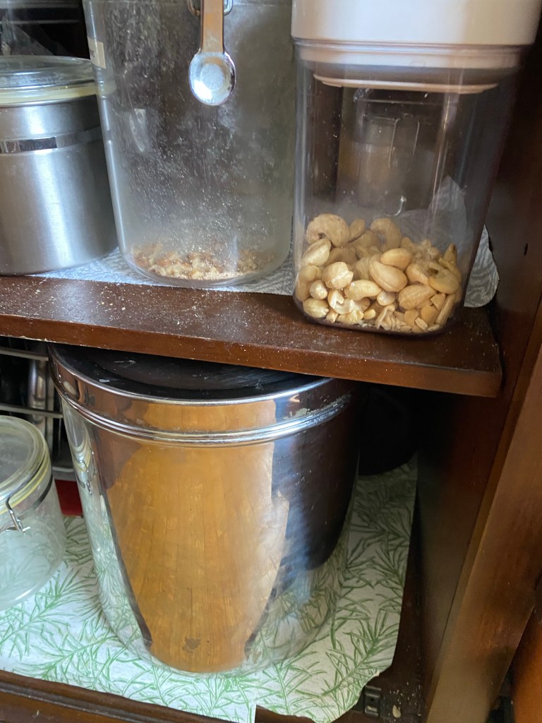 I have boxes filled with cashews and walnuts on top of my box in which I store my rice. Nuts are supposed to be one of the expensive commodities and too much intake is also not good. So these are stored in smaller containers and my 20 lb bag of rice in a big container.