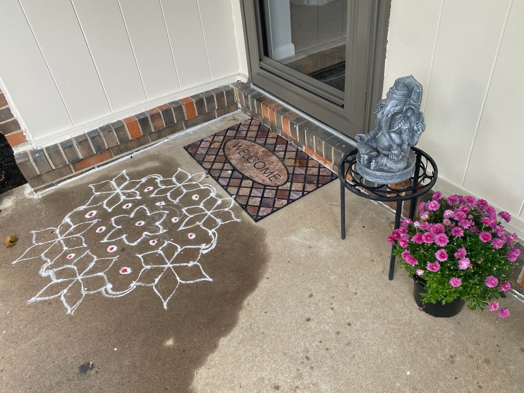 I had a yoga class and it got canceled last minute. Wearing shoes I ventured out and decided it was time to make one beautiful Rangoli or Kolam. The weather was not bad. Why did this make me remember yoga? The entire time, you are doing Rangoli, you are bending yourselves drawing the same. So, if I had the yoga class, I would have just skipped on this task entirely or would have come up with a half baked Kolam. I always use only rice flour, the concept being to feed the ants or the small insects outside. But today I decided to mix some white play sand with it and I ended having a good piece. It may not be so perfect but people dropping in didn’t want to stamp on it and come inside. So they were jumping around it. I think, that in itself made me happy!