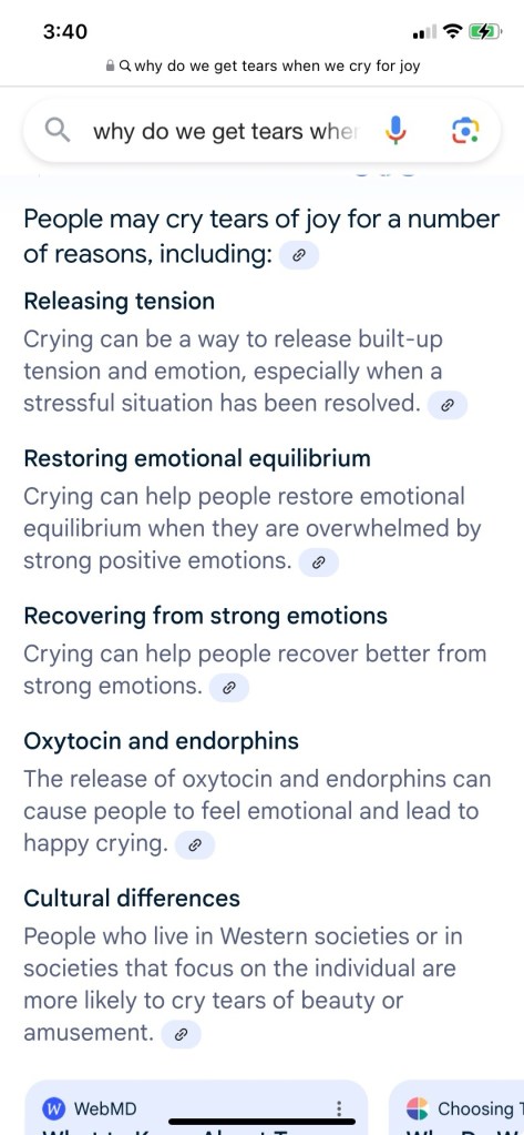 Now I shed tears during a good movie. A happily ever after situation makes me tear up! I am also emotional around babies. That is all I can think about now. Maybe if I think something else in the future, I will edit this blog amd repost again!