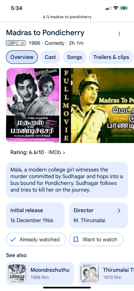 Madras is now Chennai and Pondichery is now Puducherry. I would love to see this 1960s movie when I go back home.