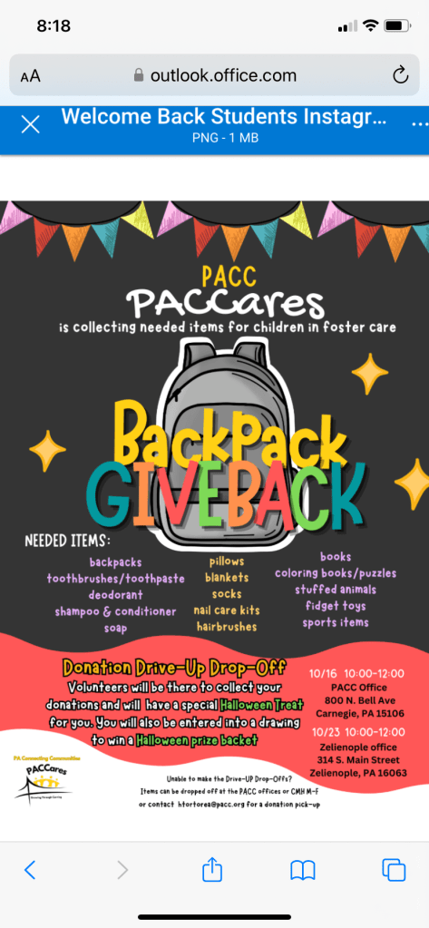 Datta retreat center is collecting canner goods for Thanksgiving and PACC (my son’s program) is doing a backpack drive.