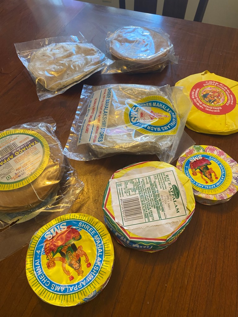 Last month, in India my final piece of shopping was getting different kinds of appalams. It is made of black gram lentils, dried in the sun. It can be stored in boxes and deep fried whenever you feel like having crisp muchies. Okay, I got six different varieties and my aunt who came to visit me got me two more.