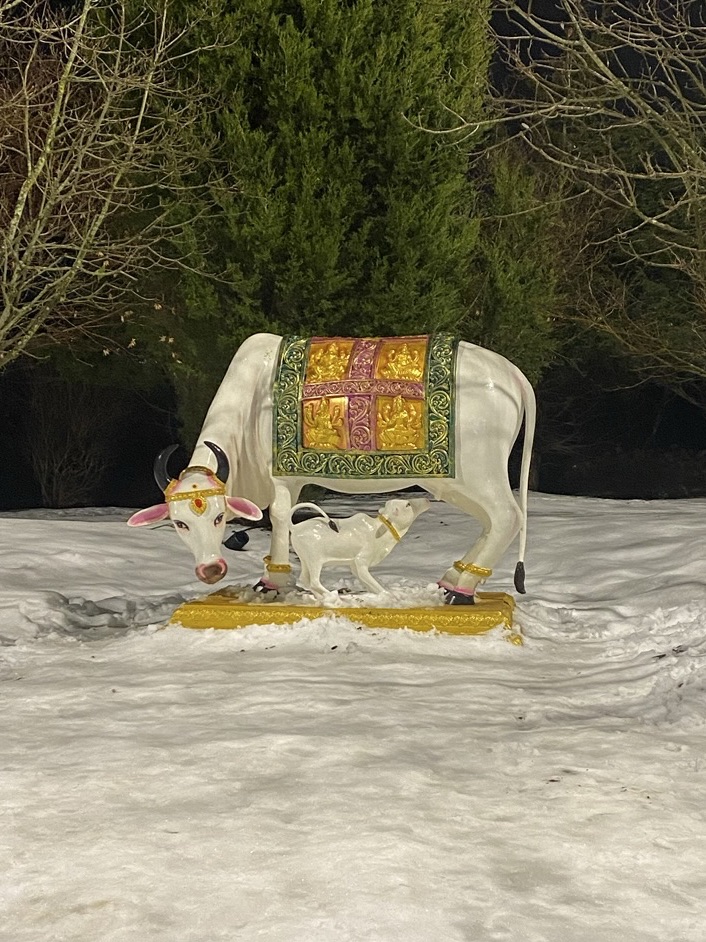 Our temple now has Kamadhenu and Nandini. celestial cow and calf sculpture in front! More signs I need to write my sanskrit exam!! An explanation for another blog.
