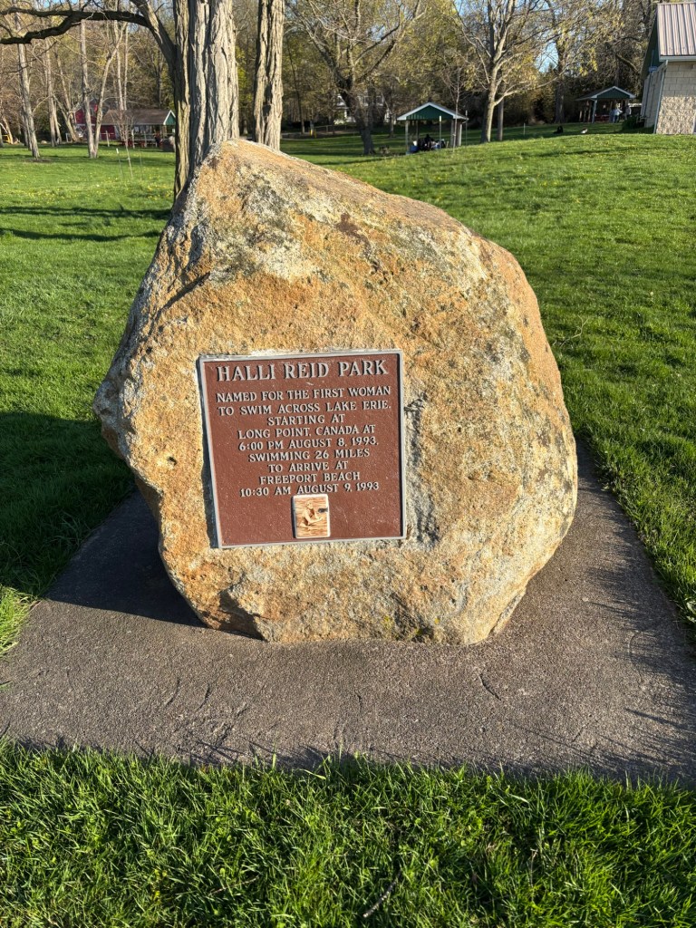 This plaque honors a person who swam across Lake Erie from Canada to a town in Pennsylvania.