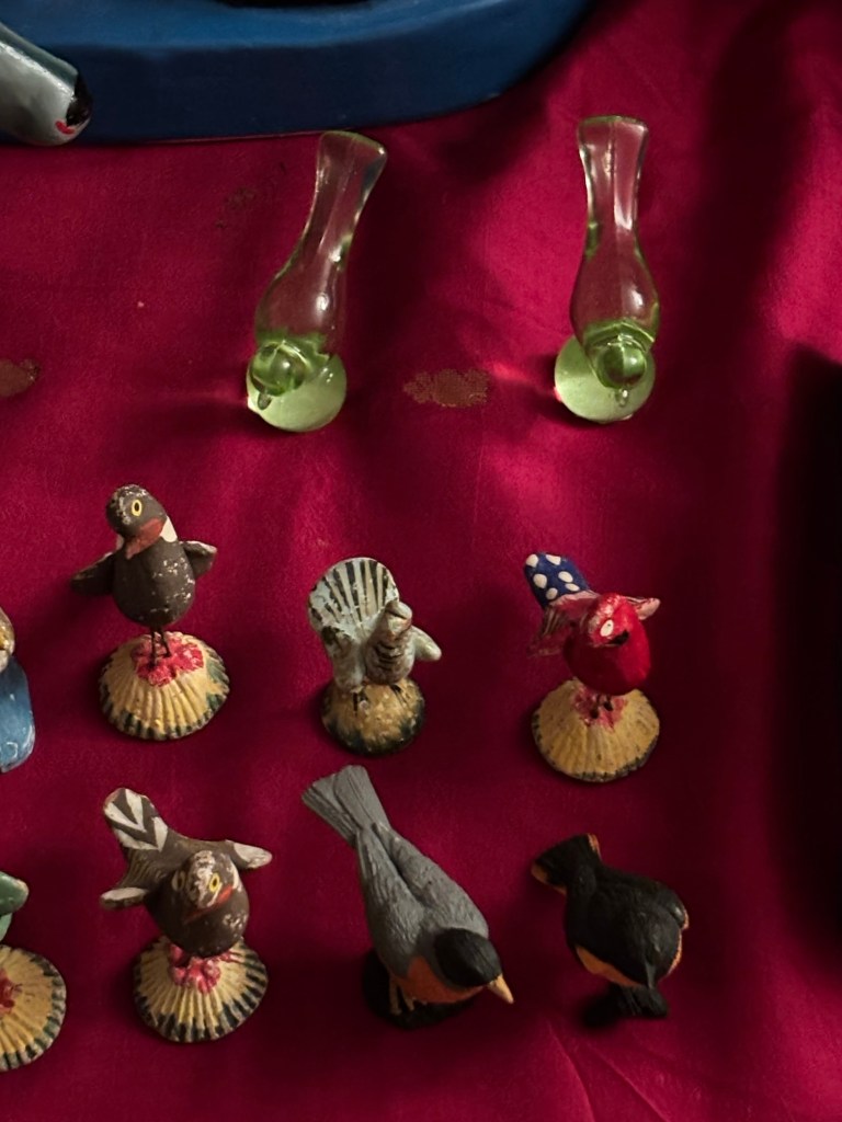 The birds on a stand belonged to my grandmother. Yes my paternal grandmother about whom I often talk about. On a trip to India one year, I asked her if I can take them and she said “yes”. These were her favorites. There are around 25 to 30 of these small birds which she had purchased at Varanasi. She used to remember her trip to Varanasi by saying, the then Prime Minister of India passed away during their visit and all the chaos that followed their trip. So I checked and it was May of 1964. So these birds are more than 60 years old.