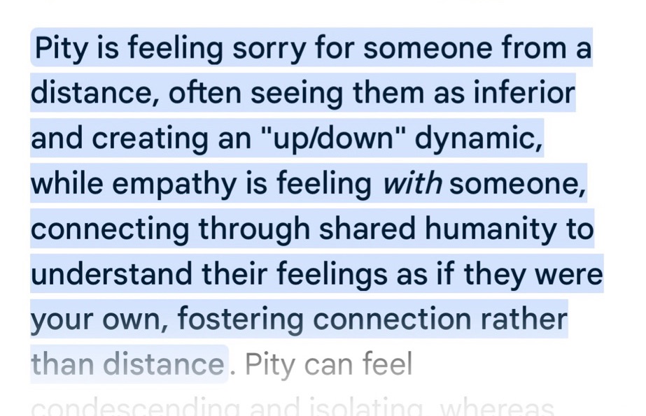 · Pity says, “You poor thing.” It creates distance, often carries a sense of superiority, and can leave the other person feeling smaller.
