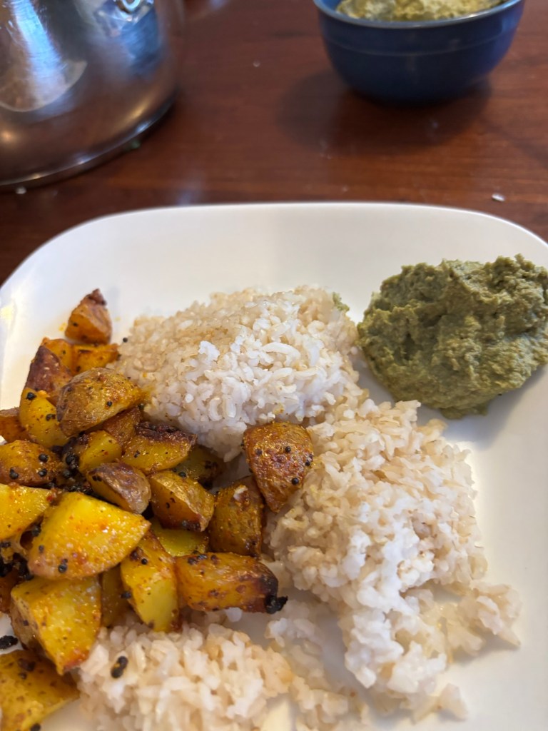 As promised a food picture. Cold days demand hot spicy food. Yesterday special was potato roast with coriander (cilantro), onion and mango chutney. The rice is brown suggested bt my bestie. It is called hand pound rice. Eating that requires an acquired taste and also requires great side dishes. It can be called a rice for people dieting. Yup, you do not have the inclination to go for a second serving 😃🤷♀️🤷♀️!