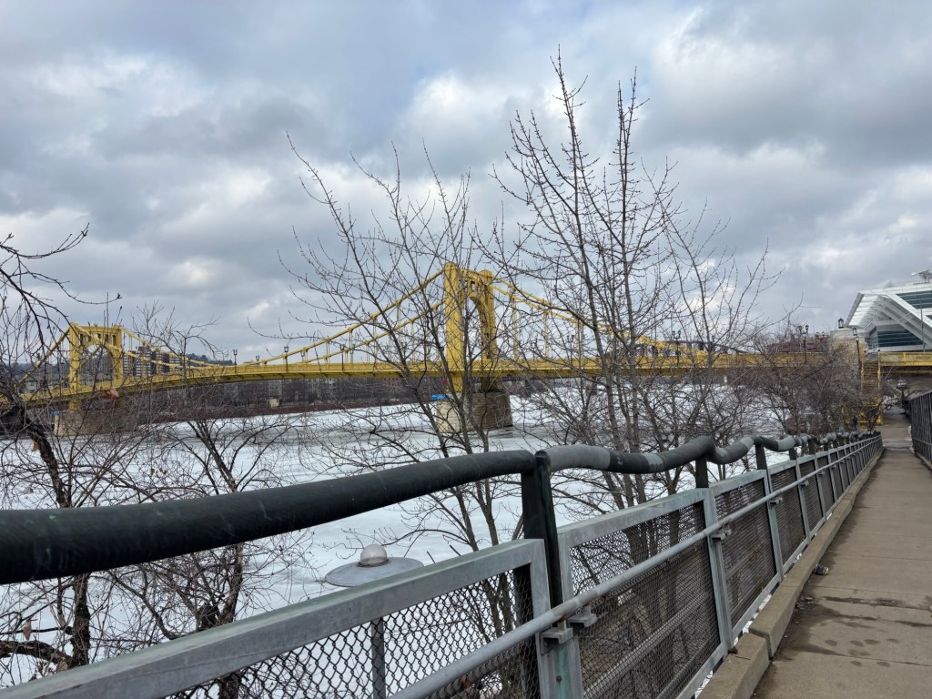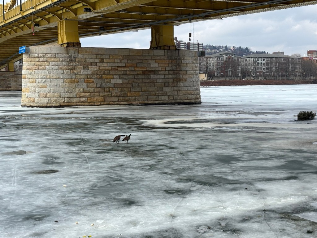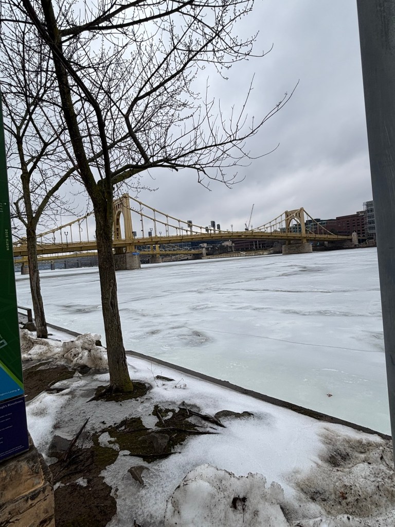 The big snowstorm of January was followed by a three-week period of below freezing temperatures. We visited Erie and saw the frozen lake. Pittsburgh has three rivers and all of them were frozen. But on the day when the temperatures rose above the freezing mark, we took a two mile walk along the Allegheny River.